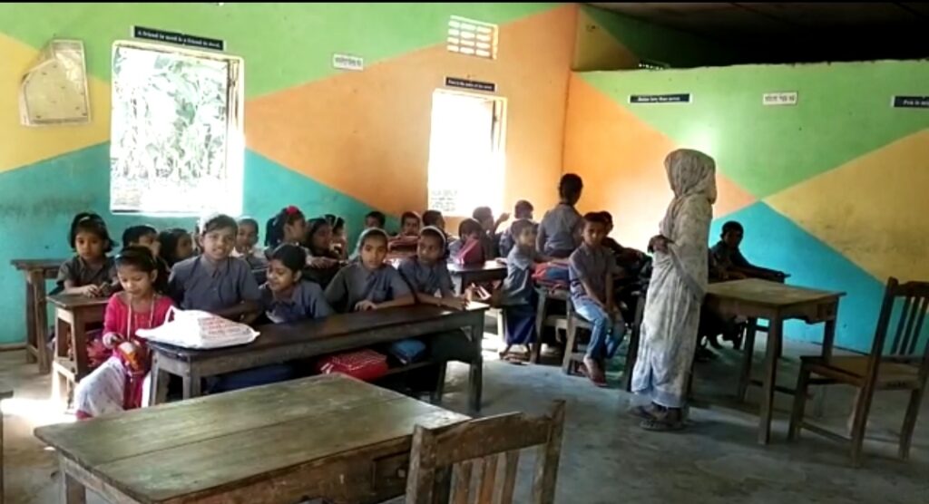 কাটিগড়া শিক্ষাকখণ্ডৰ 51 নম্বৰ গনিৰগ্ৰাম নিম্ন প্ৰাথমিক স্কুল পিছে স্কুলখনৰ শ্ৰেনীকোটাত ছাত্ৰছাত্ৰী সকলক পাঠদান কৰাই আছে এগৰাকী মহিলাই ।পুৱা স্কুলখন খোল খোৱাৰ পাছত শ্ৰেশীকোঠাত পাঠদানত এনেধৰে ব্যস্ত হৈ পৰিছে মহিলাগৰাকী।