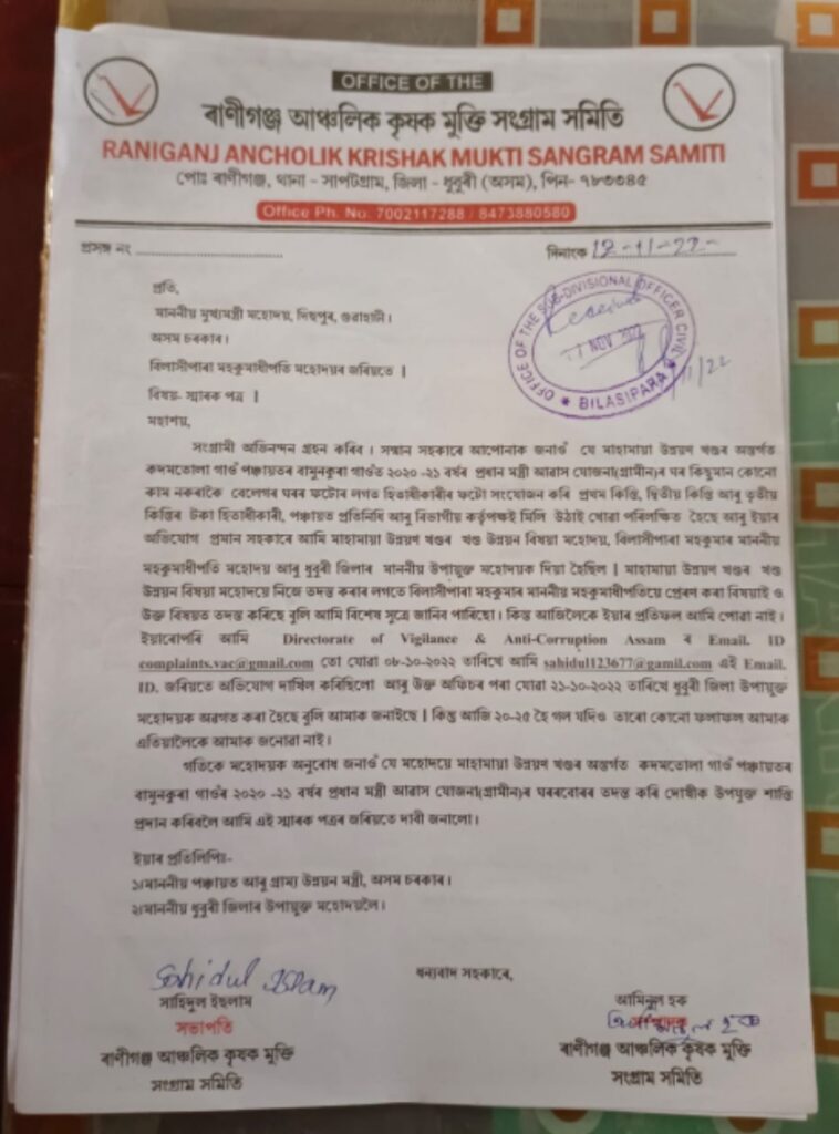 বিলাসীপাৰাৰ মহামায়া উন্নয়ন খণ্ডত এক আজব কাণ্ড।কদোমতলা গাঁও পঞ্চায়ত আচলতে হৈছে কি?ব্যৰ্থ হৈছে নেকি বিজেপি চৰকাৰ?গাঁও পঞ্চায়তৰ সভাপতি আৰু PMGAY ৰ হিতাধীকাৰীৰ গোপন বুজা বুজিৰ কথা ৰাণীগঞ্জ কৃষ্ণক মুক্তি সংগ্ৰাম সমিতিৰ ।এজন হিতাধিকাৰীৰ পৰা ২০,০০০ হাজাৰ ধন লোৱাৰ অভিযোগ কৃষ্ণক মুক্তি সংগ্ৰাম সমিতিৰ।হঠাৎ তৎপৰ হৈ উঠিল কিয় KMSS ৰ সভাপতি সাহিদল ইছলাম?