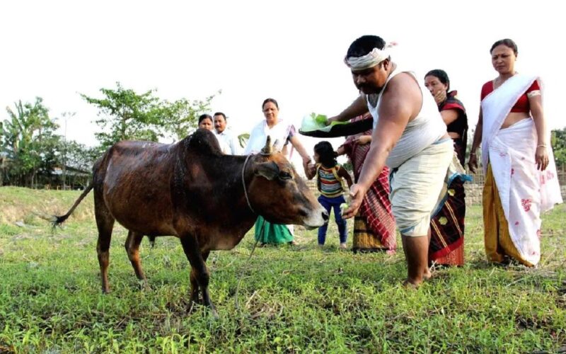 চ’ত আৰু ব’হাগ মাহৰ সংক্ৰান্তিৰ দিনা পালন কৰা হয় অসমীয়া চহা জীৱনৰ অন্যতম উৎসৱ গৰু বিহু। ৰাজ্যৰ বিভিন্ন প্ৰান্তৰ কৃষকসকলে সাতমপুৰুষীয়া ৰীতি-নীতি মানি মঙলবাৰে উদযাপন কৰিছে বিহুৰ এই প্ৰথমটো দিন। কৃষিজীৱী ৰাইজে পুৱাতেই ওচৰৰ নৈ, বিল বা পুখুৰীলৈ গৰু লৈ গৈ ধুৱাইছে গা। পৰম্পৰা অনুসৰি লাও, বেঙেনা আৰু হালধি গৰুৰ গাত দি প্ৰতিজন কৃষকে গাইছে— ‘লাও খা বেঙেনা খা, বছৰে বছৰে বাঢ়ি যা’।