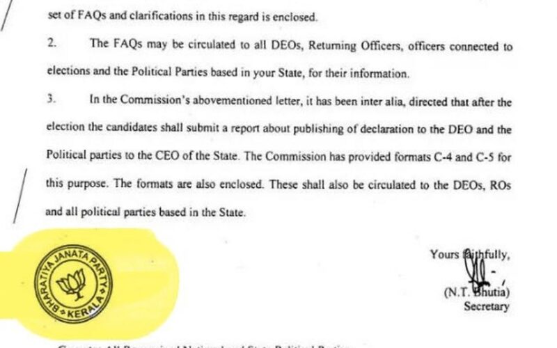 কেৰালাৰ বিধানসভা নিৰ্বাচনৰ ব্যস্ততাৰ মাজতে নিৰ্বাচনী আয়োগৰ এক পত্ৰত ভাৰতীয় জনতা পাৰ্টিৰ চীল থকাক কেন্দ্ৰ কৰি সোমবাৰে আৰম্ভ হয় এক প্ৰচণ্ড ৰাজনৈতিক বিতৰ্কৰ। ২০১৯ চনৰ নিৰ্বাচনী নিৰ্দেশনা সম্বলিত এখন চৰকাৰী পত্ৰত বিজেপিৰ কেৰালা শাখাৰ মোহৰ স্পষ্টকৈ দেখা পোৱাৰ পিছতে দেশজুৰি সৃষ্টি হয় তীব্ৰ প্ৰতিক্ৰিয়াৰ।