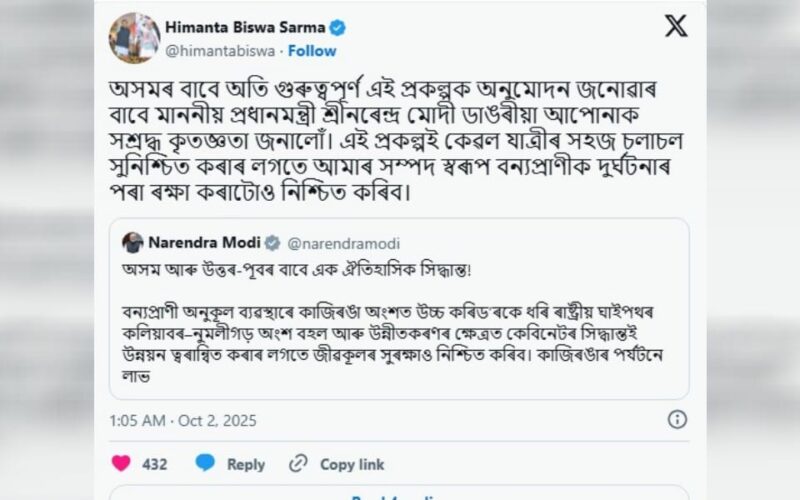 পূজাৰ বতৰত অসমবাসীৰ বাবে সুখবৰ । অৱশেষত ইউনেস্ক’ৰ বিশ্ব ঐতিহ্য ক্ষেত্ৰ কাজিৰঙা ৰাষ্ট্ৰীয় উদ্যানৰ ভিতৰত জীৱ-জন্তুৰ বাধাহীন চলাচল সুনিশ্চিত কৰিবলৈ ৩৪.৪৫ কিলোমিটাৰ এলিভেটেড কৰিড’ৰৰ বাবে বিত্তীয় অনুমোদন কেন্দ্ৰীয় চৰকাৰৰ ৷ কেন্দ্ৰীয় কেবিনেটে অনুমোদন জনাইছে কলিয়াবৰ-নুমলীগড় ৰাষ্ট্ৰীয় ঘাইপথৰ মুঠ ৮৫ কিলোমিটাৰ সম্প্ৰসাৰণত ।অসমৰ মুখ্যমন্ত্ৰী ড৹ হিমন্ত বিশ্ব শৰ্মাই সামাজিক মাধ্যমযোগে সদৰী কৰিছে যে কেন্দ্ৰীয় চৰকাৰে ৰাষ্ট্ৰীয় ঘাইপথ ‘NH-715’ৰ কালিয়াবৰ-নুমলীগড় অংশৰ সম্প্ৰসাৰণৰ বাবে বুধবাৰে অনুমোদন জনাইছে । লগতে কাজিৰঙা ৰাষ্ট্ৰীয় উদ্যানৰ মাজেৰে নিৰ্মাণ হ’বলগীয়া ৩৪ কিলোমিটাৰ দৈৰ্ঘ্যৰ এলিভেটেড কৰিডৰ প্ৰকল্পৰো অনুমোদন দিছে । এই প্ৰকল্পই অসমৰ সংযোগ ব্যৱস্থাত এক নতুন মাত্ৰা যোগ কৰিব আৰু মানুহ আৰু বন্যপ্ৰাণীৰ সহাৱস্থানৰ এক নতুন নজিৰ স্থাপন কৰিব বুলি অসমৰ মুখ্যমন্ত্ৰীয়ে আশা প্ৰকাশ কৰিছে ৷