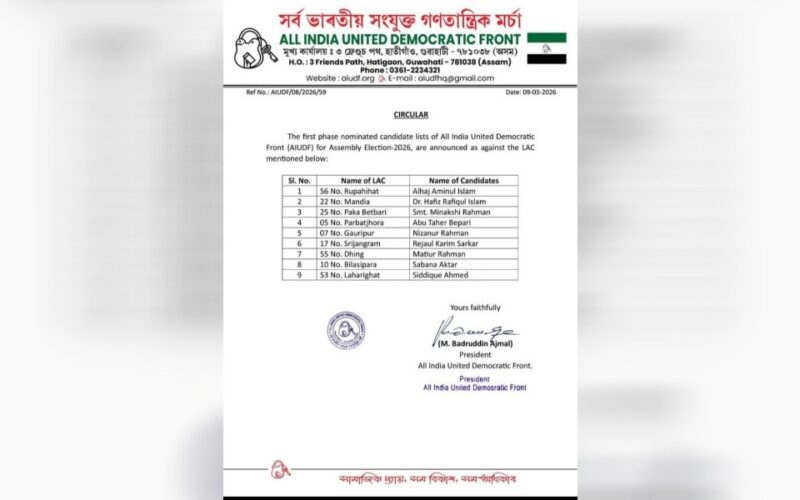 ৯ টা সমষ্টিৰ বাবে প্ৰাৰ্থীৰ নাম ঘোষণা AIUDFৰ